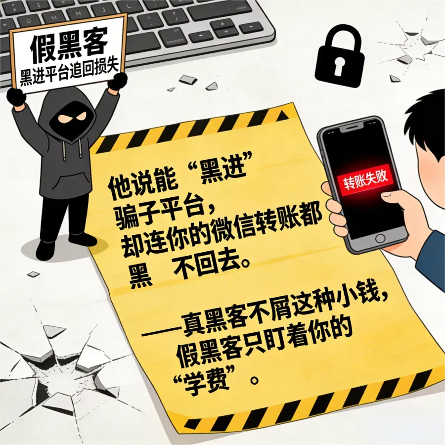 话术:“我可以通过技术手段拦截/入侵平台拿回你的钱”